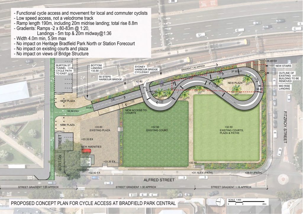 Transport for NSW advocates building a linear ramp for cyclists between the bridge and Alfred Street – right through the middle of Bradfield Park.